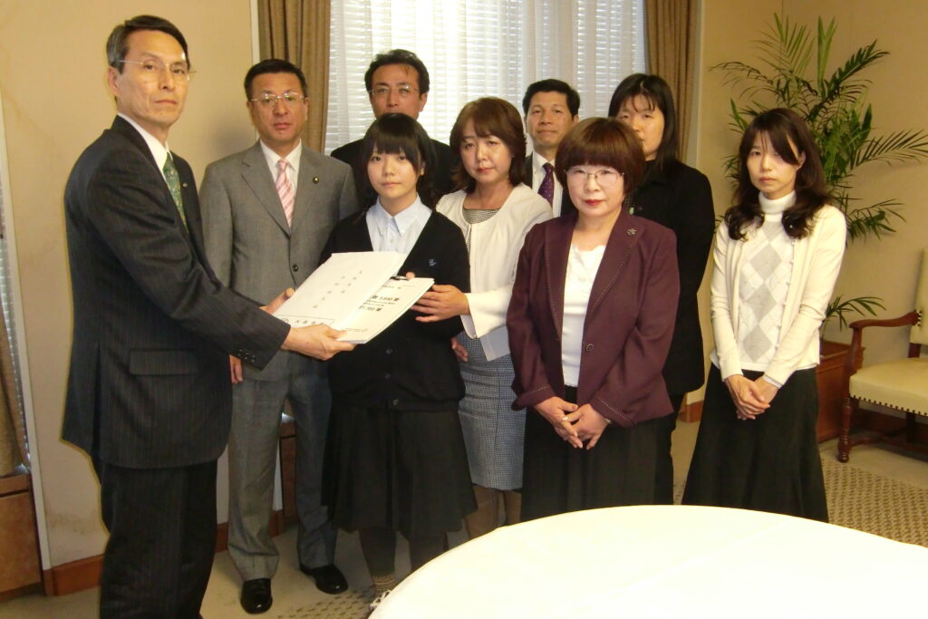 万膳志帆さん(前列左から2人目)、子ども支援チーム・万膳京子大阪府代表(同左から3人目)から 森下副市長(左端)に要望書を手渡し、患者に対する支援体制の整備を要望しました。子ども支援チーム・鈴木代表(前列右から2人目)、神田さん、飛田さんも同席して頂きました。
