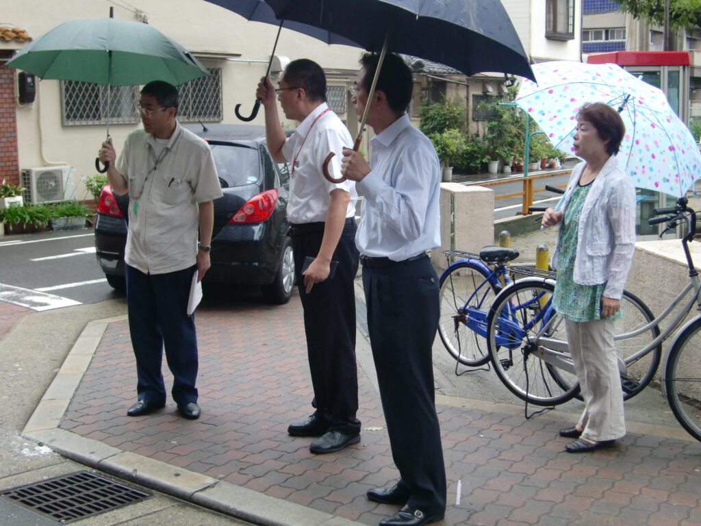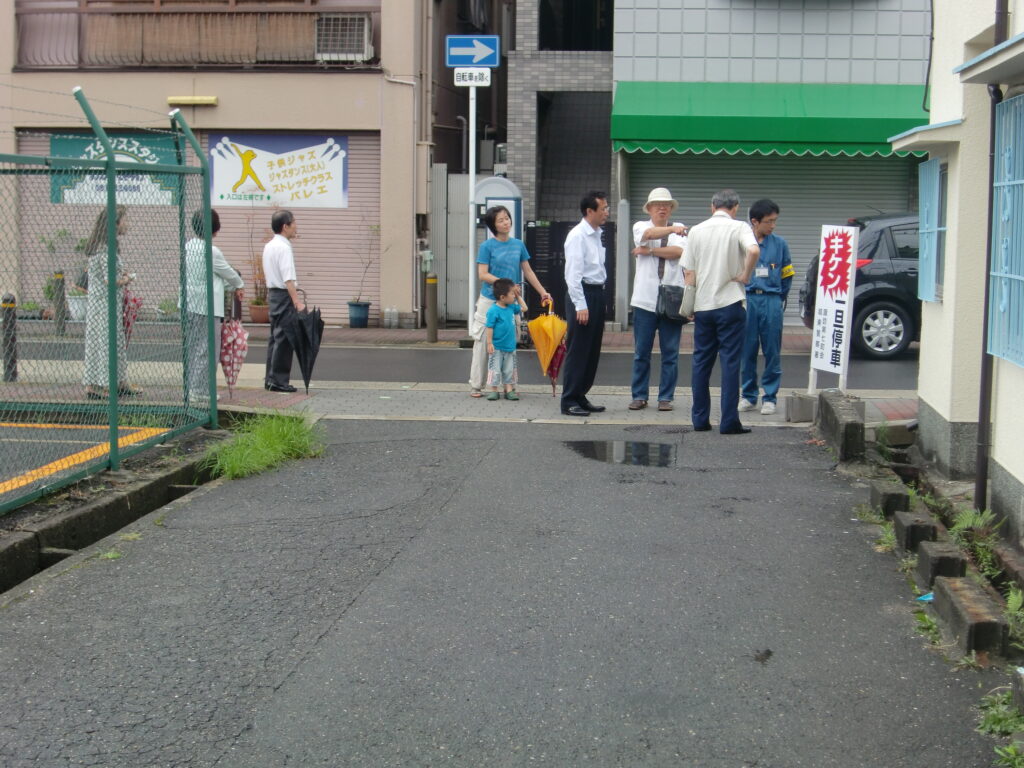 7/7(木)、横断歩道設置要望箇所3か所、カーブミラー設置要望箇所1か所、京阪高架下カーブミラー設置要望箇所1か所、私道にとまれ標識設置要望1か所など現地調査並びに現地立会で地域安全点検を実施しました。