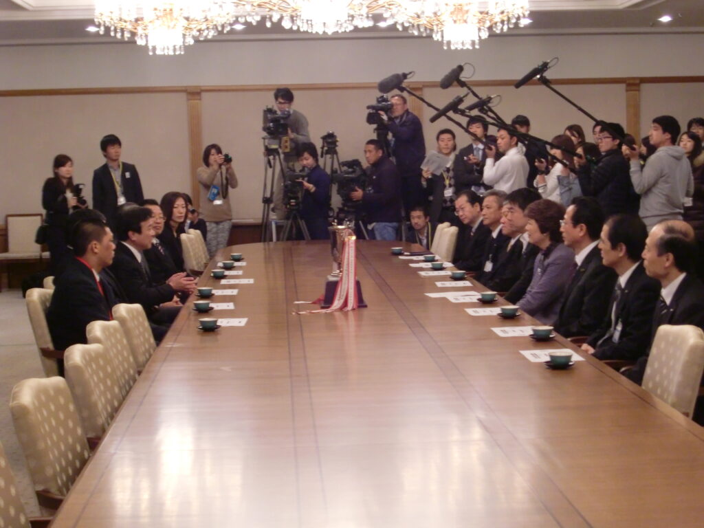 山田主将から優勝報告、橋下市長も絶賛し和やかな懇談会となりました 準々決勝で強豪伏見工業に27対26で競り勝ち、準決勝・国学院久我山に57対0の完封勝ち、決勝は御所実業に17対14で花園の地元、大阪に4大会ぶりに優勝旗を取り返した。