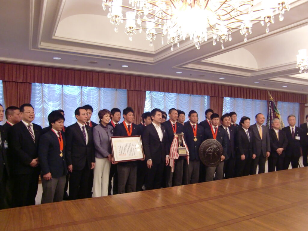 1/11(金)、第92回全国高等学校ラクビーフットボール大会で優勝した『常翔学園高等学校ラクビー部』が大阪市に表敬訪問。