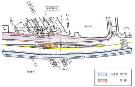 道路中央部に幅3.08mの橋台があり、聖賢小学校側の歩道幅員は0.67mであり、人が一人通れる状況でしかありません。地域の関係者から幾度となく「安全に通行ができるよう改善要請」がありました。おおさか東線の工事に合わせて改善されることになりました。