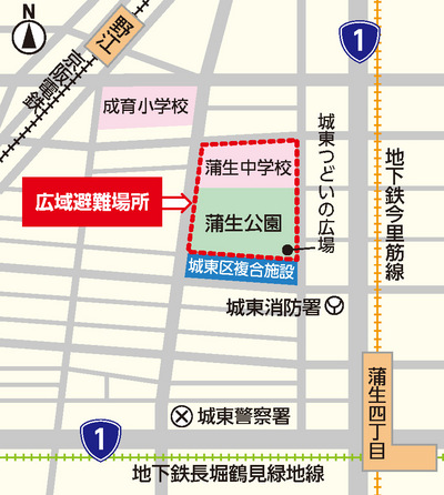 災害対策基本法に基づき、城東区新庁舎に隣接している「蒲生公園」と「蒲生中学校」が、災害時(大規模な火事や地震)の”広域避難場所”にH28年4月に指定されました。