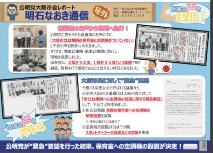2018/8/22の公明新聞・7面に、来年夏までに「市立幼稚園の保育室への空調機の設置が決定した記事が掲載されました。 今夏の猛暑対策として、スポットクーラーやミスト、遮光ネットなど緊急対応も実施されます。 地域の声を聞き、これからも全力で頑張って参ります。