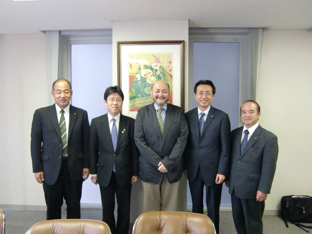 左側から、藤浦市会議員(摂津市議会議長)、加治木府会議員、新川教授、 本人、 島吹田市会議員