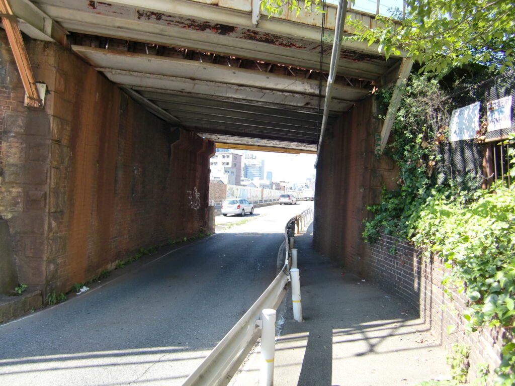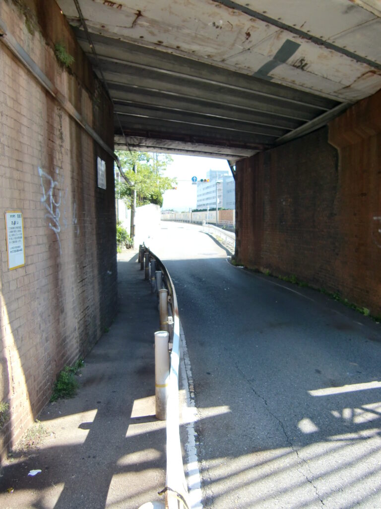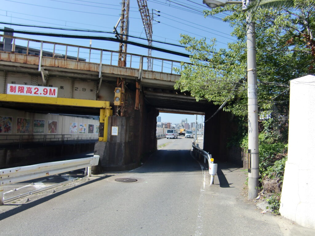 城東貨物線の橋台がせり出していて歩道が狭く自転車がなんとか通行できる程度の幅員しかなく、危険な箇所です