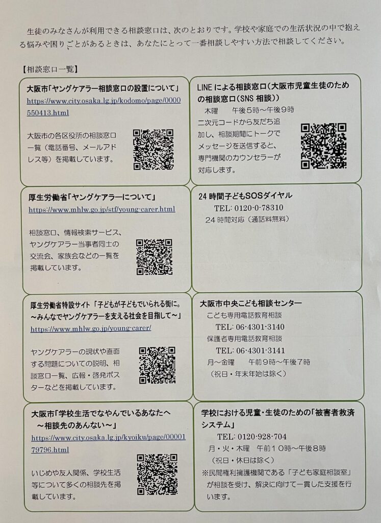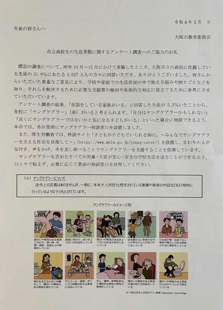 市立高校は今年の4月から府立高校へ移管されます。市立高校の実態調査では、回答者の5.3% 193名が世話をしている家族がいると回答しています。そのうち「学校に伝えてもよい」と名前を回答した47名の生徒から個別面談を実施中であると報告がありました。学校に伝えることを望んでいない146名についても、何らかのアプローチを行い、必要な支援につなげることが必要であると考えている。高等学校については4月から大阪府へ移管することになるが、3/15の市立高校としての最後の終業式の日に、あらためて全ての生徒に、ヤングケアラーの意味、家庭生活の中で抱える悩みや、困りごとなどの相談窓口を周知し支援につなげたいと「生徒の皆さんが利用できるヤングケアラーの相談窓口一覧」を配布しました。